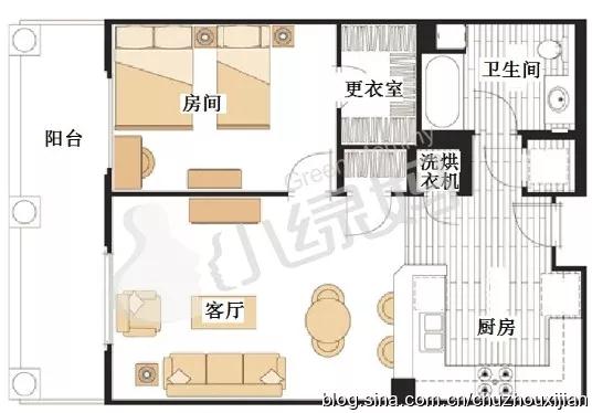 这是小绿妈豪华一房一卫房型,一房一厅一厨一卫,使用面积在60-70平米,除了厨房是开放式,其他与中国房型没有多大区别。