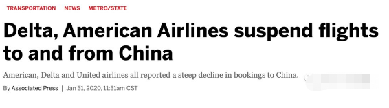 就在今天,达美航空在新闻中表示:已决定从2月6日至4月30日暂停所有美国飞往中国的航班。