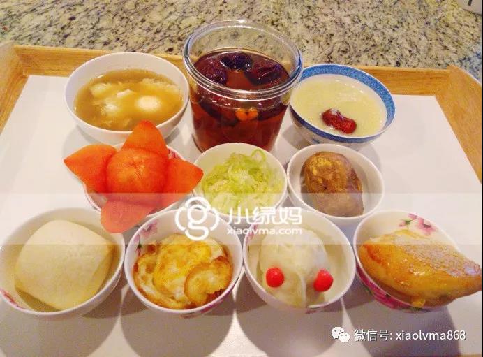 早餐有酒酿鸡蛋、粥类、主食和杂粮、蛋类和配菜。 酒酿催乳,小绿妈月子早餐每天必备。 粥的种类一周不重样,有小米蛋花粥、桂圆糯米粥、瘦肉粥、薏米粥、鲜贝粥、鱼片粥等等。 主食都是纯天然手工自制,包子、馒头、饼等;杂粮促进肠蠕动,玉米、红薯、南瓜、芋头等换着花样,减少产后便秘问题。 蛋类提供蛋白质,促进产后伤口恢复,白煮蛋、炒蛋、枸杞蒸蛋等换换花样制作。 配菜体现了各馆的区别,豪华馆3个配菜外加台湾养身糊,尊享馆早餐月子配菜高蛋白优质食材,三文鱼、牛排、大虾等,高蛋白有助于伤口愈合,珍芯随意1个小菜。